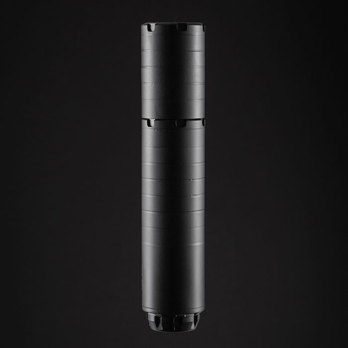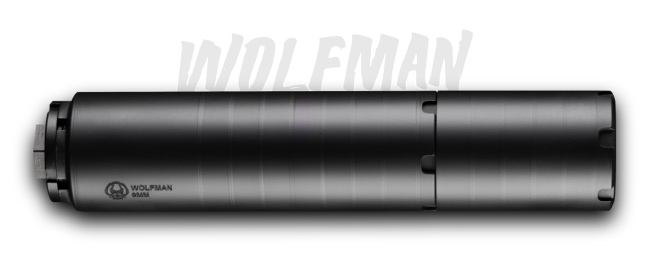 The Wolfman is the next generation of suppression. Like its predecessor, it’s a modular, multi-caliber suppressor. It specializes in subgun, light-duty rifle, and pistol use. It provides ultimate suppression in its full-length configuration while still providing exceptional performance when set up in the short configuration. The Wolfman also has an Ace up its sleeve, the front cap can contain a user-provided rubber wipe that can drop suppression levels even further.
